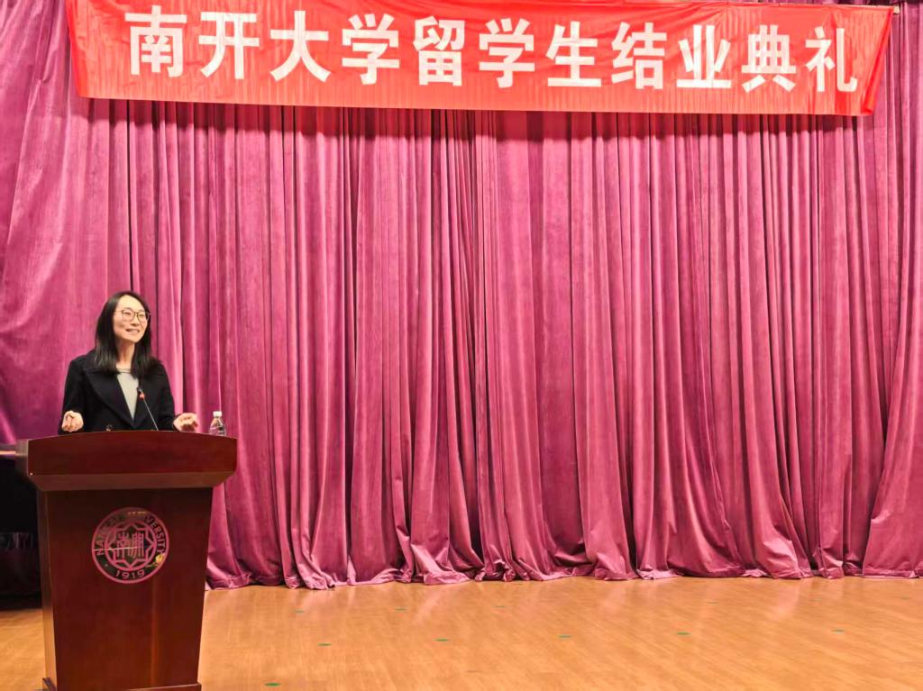 党委副书记、副院长王毓钧代表学院向顺利完成学业的留学生同学表示祝贺。她勉励同学们将所学化作连接中国与各自国家的友谊之桥,做多元文化的建设者与文明交流的使者,诚挚邀请大家未来重归南开、重访天津,再叙师生情、共话新篇章。