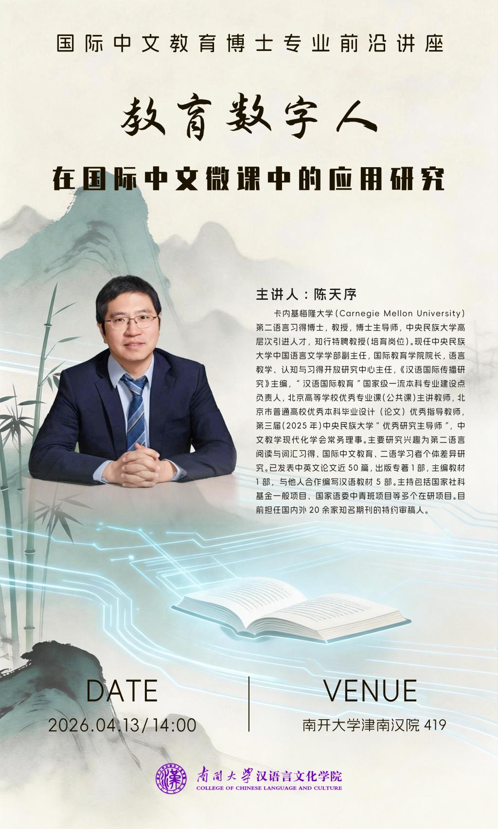 主办的“国际中文教育博士专业前沿讲座”,在成人直播津南汉院419室如期举行。本次讲座特邀中央民族大学高层次引进人才、知行特聘教授陈天序为主讲人,讲座题目为“教育数字人在国际中文微课中的应用研究”。讲座由成人直播