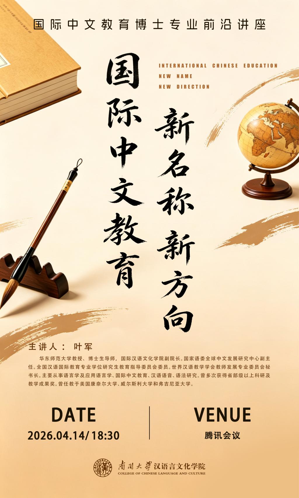 “国际中文教育博士专业前沿讲座”,特邀华东师范大学叶军教授主讲“新时代国际中文教育:新名称·新方向”。讲座由成人直播